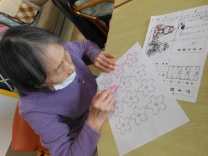 その後、計測した数字を自分で記入していただき、お昼のメニューを書いたり、色塗りをしたりとゆっくりとした時間が過ぎ・・・