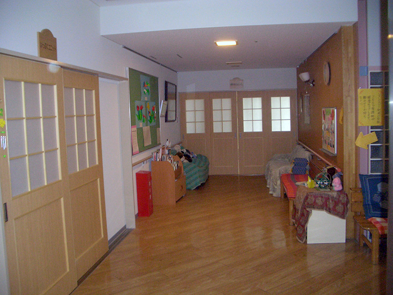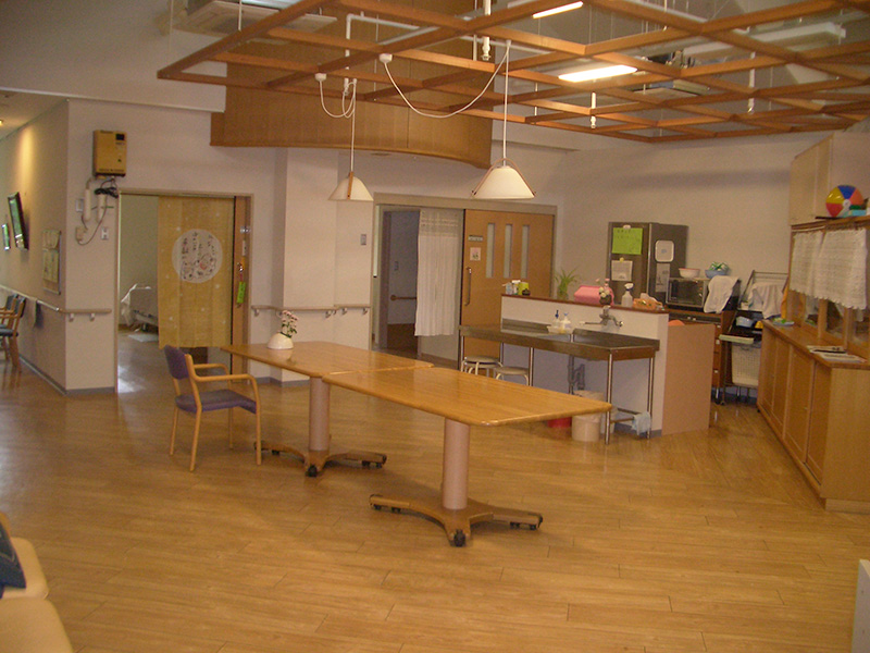 「いっぷくユニット」10名の利用者のための共同生活室です。自宅の食堂やリビングのようなくつろぎがあります。「まめなけユニット」10名の利用者にも同様の共同生活室があります。